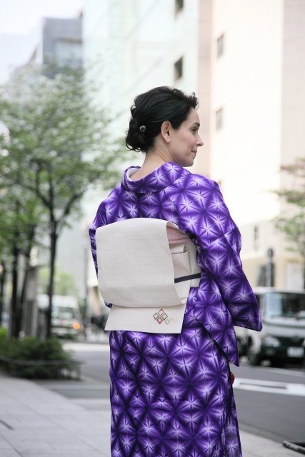 深い紫の雪花絞りには、花織の名古屋帯。お太鼓部分は白っぽい花織で、たれの部分にだけ色のついた花織で可愛らしいポイントになっています。