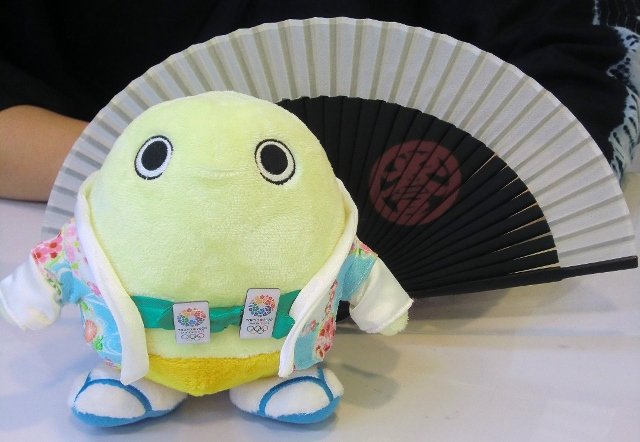 よーく見て頂くと、2020年の東京オリンピック誘致のピンバッチを2個も付けています。お客様に頂いてスタッフが付けているのを見て、三人とも付けたそうだったのですが、洋服を着ているのが、まゆまろ君一人だったので、代表して付けてみたんですよ。