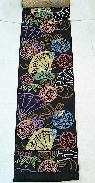 松竹梅にまりに、檜扇と様々な柄が黒い地の上に踊る素敵な名古屋帯です。普段お出掛けはもちろん、少し改まったお席にもお使いいただける一本です。