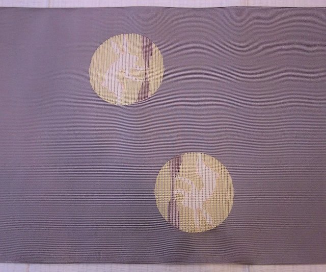 お太鼓部分には、綴れでうさぎとかめが、そして絽綴れで月が織り出されています。前柄部分は絽綴れで、うさぎさんがお月様でお餅をついている姿が丁寧に織り出されています。