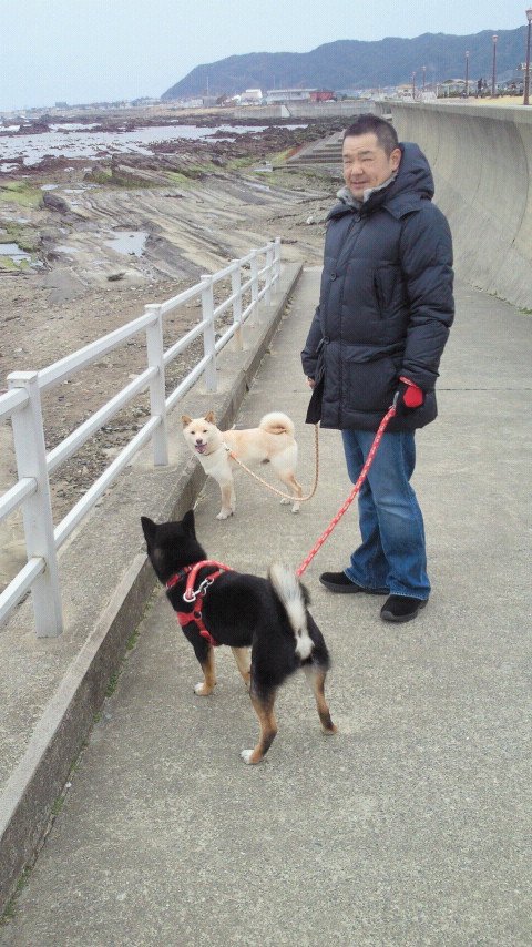りきや君は黒柴君です。もう一匹は弟のぎんが君です。2月の房総はまだ寒そうですね。店長の顔が、風に負けている気配がありますねえ。