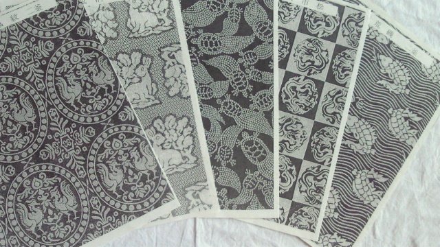 柄は、色々なものがあり名物裂で見られる有栖川文様や笹蔓文様、正倉院文様に見られる葡萄唐草や狩猟文などおおくの柄があります。色は、赤、紺、茶、緑と4色でご用意しております。