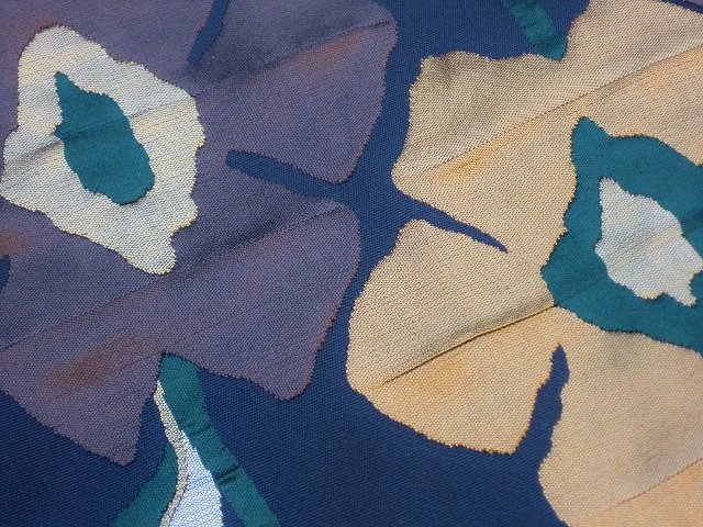 墨色地に個性的なお花がふくれ織りで織り出されたおしゃれな帯です。斜めに伸びるように織ってあるので、とても締めやすいです。