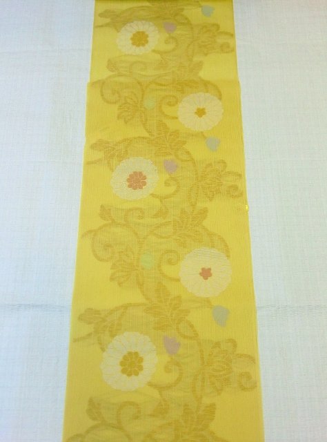 現在開催中の第二回『帯屋捨松展』から素敵な夏名古屋帯をご紹介します☆菊唐草柄のこの夏名古屋帯は、黄色の地色に大きめの菊唐草が織り出されています。まあるく文様化された菊なので、とてもかわいらしく色々なお着物に合わせてお使いいただけます。