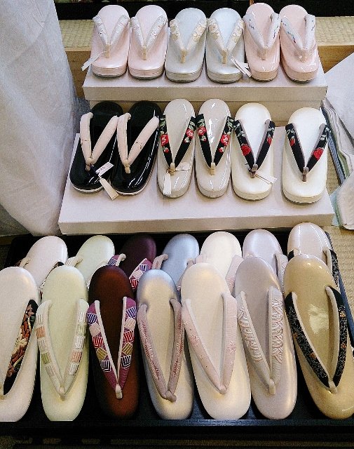 お草履はすげあがりでご用意しております。台は、一段、二段、三段、小判型、ほっそり型など、色々なタイプをご用意しております。花緒はふっくらしたタイプを使っているので足の辺りがやさしく、疲れにくく履き易いお草履ばかりです。