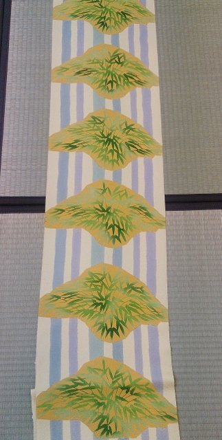 稲垣稔次郎型絵染の名古屋帯をご紹介します。巾の違う縞模様の上に笹柄の型絵染です!クリーム色の地に笹の緑色の濃淡がとても鮮やかです。この帯も、現在開催中のSUMER SALE対象商品になりますので、とってもお買い得になっておりますので、ぜひお店でチェックしてみてくださいね。