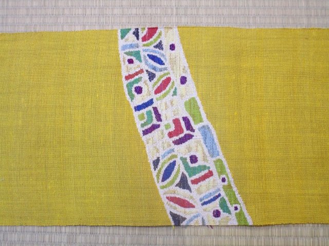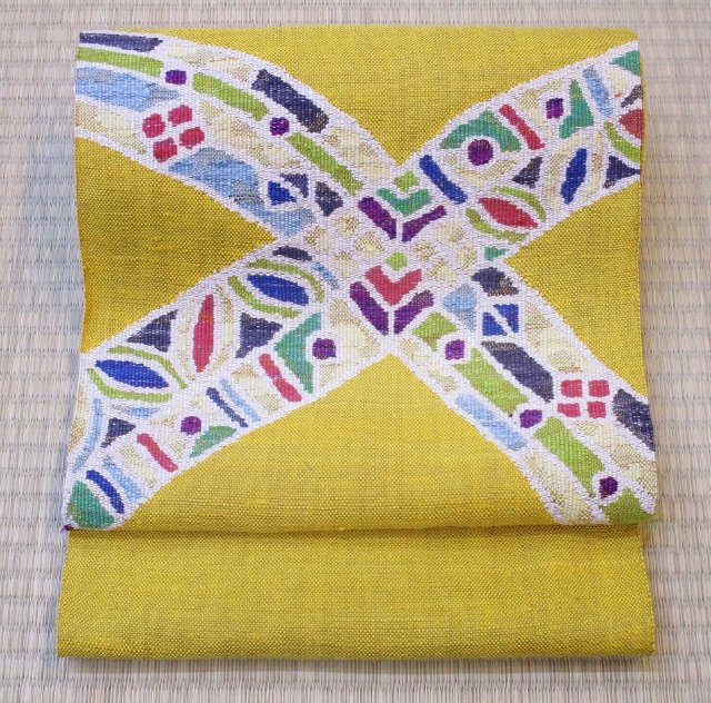 近代ステンド文と言う名前の付いたこの帯は、からし色の地色にモダンなステンドグラスのような模様が、クロスに入っています。立体感のある織なので、地の上に模様がアップリケされているようにぷっくり出ている感じです。