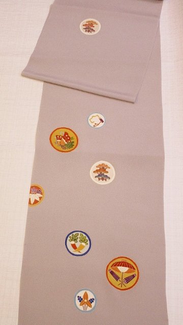 今日ご紹介するのは、狂言の丸模様の付下げです☆縮緬地に上品な友禅で仕上げています。丸紋の中には、吉祥柄が詰まっています。