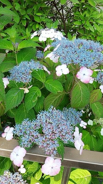 雨に濡れた姿もきれいですが、キラキラ太陽の下のガクアジサイも色が鮮やかで綺麗ですね。