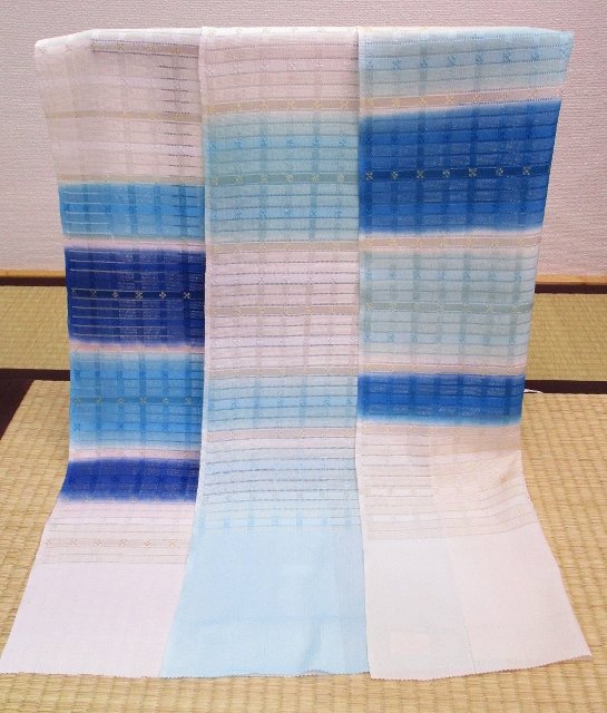 花倉織の様にも見える変わり織りされている生地にそれぞれブルーの三段染になっていておしゃれです。