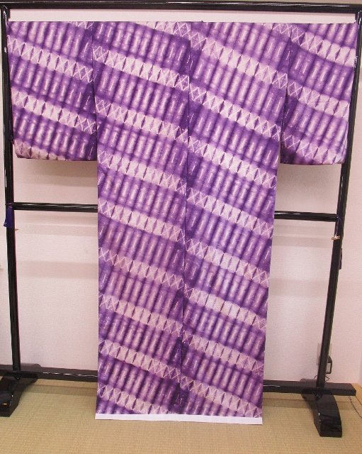 ぜんまいの白生地を紫根で染めています。斜め取りのようになった絞りの模様が印象的なお着物です。