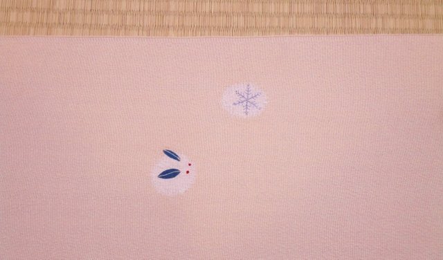 丸く絞った所を雪うさぎにみたてたり、窓の様にみたてて様々な冬のお花がのぞいたりしています。アップリケだったり、刺繍だったりするので、全体的に立体感があり、ひとつひとつが印象的です。