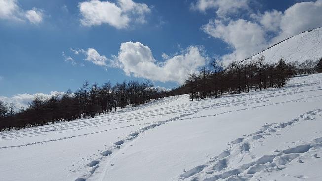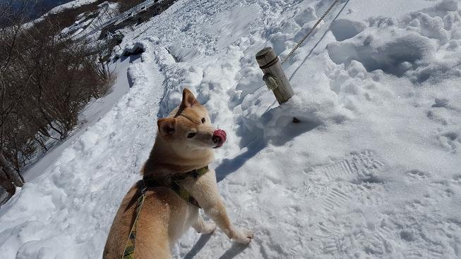 少し休憩してから下ったのですが、リキヤは疲れてしまったのか雪の上で寝てしまいました。1分ぐらいで起きましたが、雪の上で寝るなんて張り切りすぎたんでしょうね。