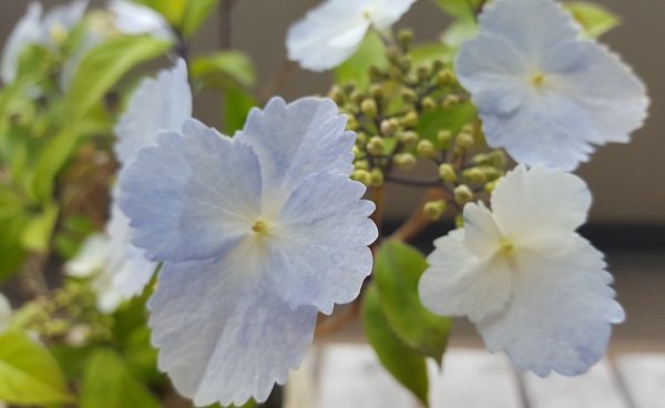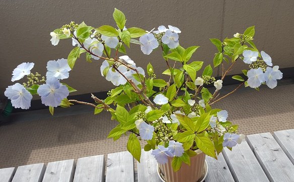 頂いた時は白いあじさいでしたがなぜか薄い紫色?青色?で咲きました!!