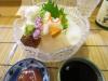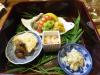 八寸です。枝豆ととうもろこしのかき揚げ、えびさん、ち鮎、そしてはもの珍味の数々。美味しい