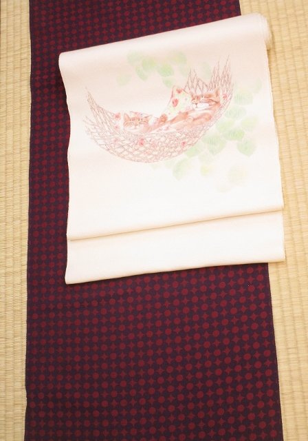クリーム色の優しい地色に、木漏れ日の中、気持ち良さそうに眠るネコちゃん達が描かれています。お太鼓はハンモックに。前柄はブランコ!?にごろりんっとくつろいでいます♪