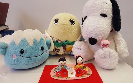 毎年、この小さいお雛様をスヌーピーくんとまゆまろ君とふじさん君が見守ってくれていますが、今年はもう一匹見守るというよりは悪い顔?で見ている子が。。。