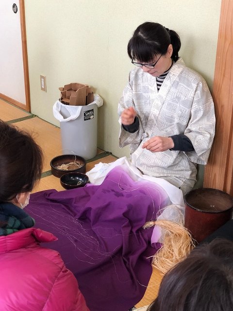 乾燥すると糸が切れてしまうので、この雪の積もった空気感が良いと言うう事で、窓を開けての作業なので、厚着をして、電気毛布をかけていらっしゃいました。