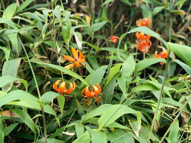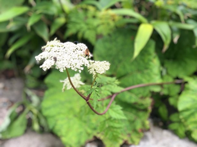 ガマ沼まで行きは登り道で少しフーフー言いながら登っていきましたが、可愛らしい高山植物がいっぱい。そして、お花に蜂さんが集まってお食事中だったりと、ゆったりとした時間が流れていました。白い小さなお花がたくさん集まっているのが〝ミヤマセンキュウ〟花弁がくるりんとまるまっている小ぶりのユリの花は〝クルマユリ〟です。