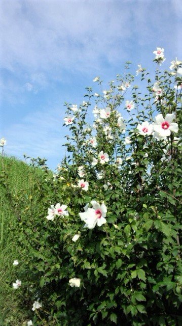 秋めいてきたお空とぐんぐん伸びて生命力あふれるむくげとの対比がきれいですね。
