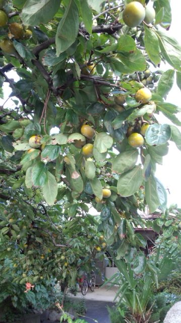 今日のプーさん店長さんとりきちゃん、ぎんちゃんのお散歩はとても心地よいいい気候だったようですよ。そして今日のパチリは〝柿さん〟です。この、まだ色づく前の固そうな柿さんがだんだんと色づくにつれて、秋がやってくるのでしょうね。