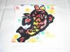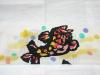 絽塩瀬の生地に荒磯ををモダンに描いています。荒磯柄は名物裂に見られる波間に踊る鯉を織り出している柄で、小物などにもよく見られる柄です。その昔からの柄を、カラフルな色使いで表現しています。