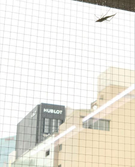7月3日の金曜日に出勤すると、窓にバッタさんがペタリと張り付いていました!!