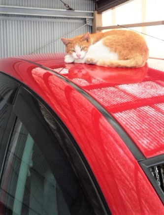 今日は車の上でお昼寝していた猫さんがお目目をあけてギロリ!?