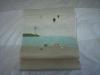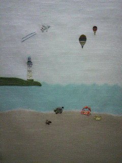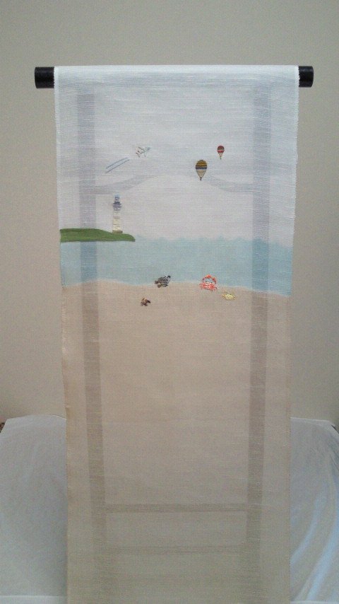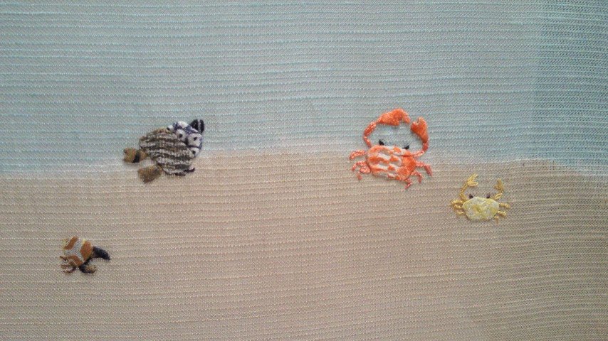 古布で作られた灯台や気球、とおくに飛び立つ飛行機も見えますね。私のおすすめは、浜辺のヤドカリ君とカニさんです!赤いカニさんの微妙な色の加減は本物のようですよ。