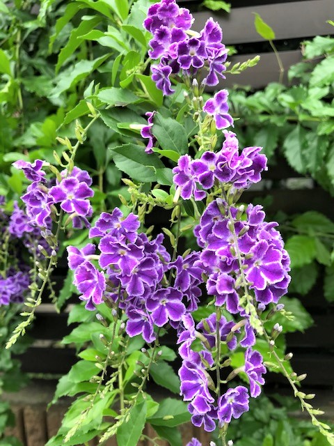 プーさん店長さんとりきちゃん、ぎんちゃんのお散歩から届いた写真は『デュランタタカラヅカ』です。鮮やかな紫色のお花にくっきり白い輪郭が華やかさを際立たせます。