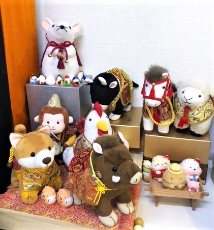 おうまさんから始まった龍村美術織物の干支マスコットも来年のうしさんで8匹目になります!!最初の頃はゆったりと並んでいたのですが、今は密です!!