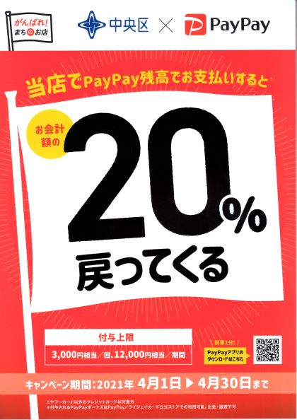 中央区でpaypay!最大20%戻ってくるキャンペーン開催中です!