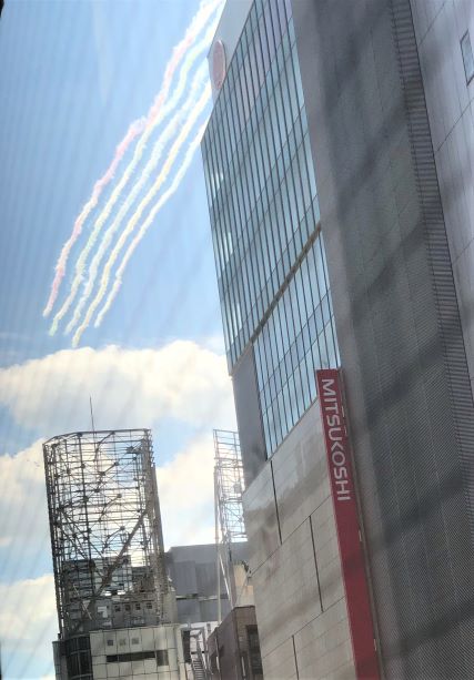 すったもんだあって、まだまだ色々な意見はありますが、きょう2020東京オリンピック開会式ですね。お店の上空をブルーインパルスが通過したので、あわてて窓越しにパチリ♪かすかに五色の色見えますか?