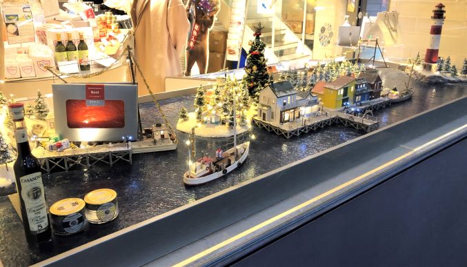 〝きもの白〟の目の前にある美味しいサーモンで有名な『王子サーモン』さんのディスプレイがクリスマス仕様の素敵なジオラマになりました。海外に気軽に行けない今だからこそ、北欧の港町のクリスマスの雰囲気をジオラマで楽しんでみてくださいね♪