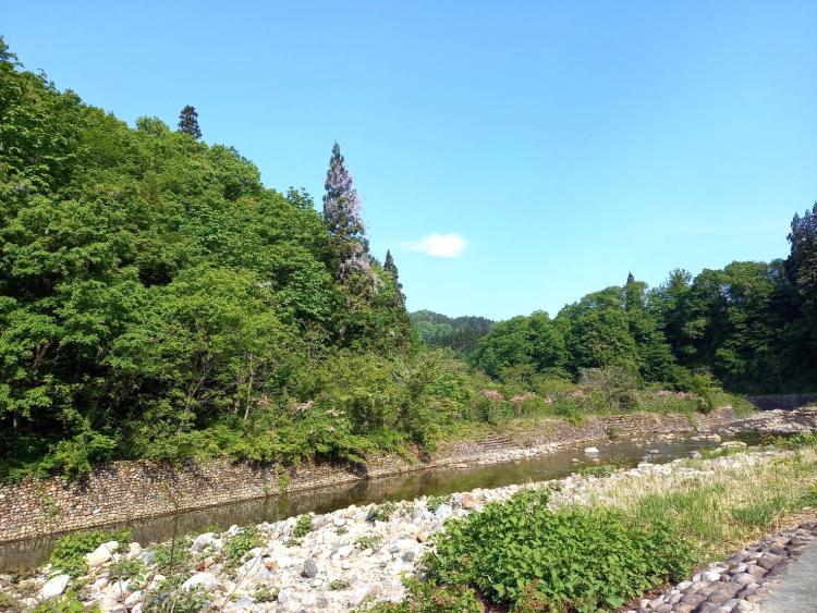 川のせせらぎと新緑。よーく見ると木に巻き付いている薄紫色の山藤も!!写真から美味しい空気が流れ込んでくるような気がします。
