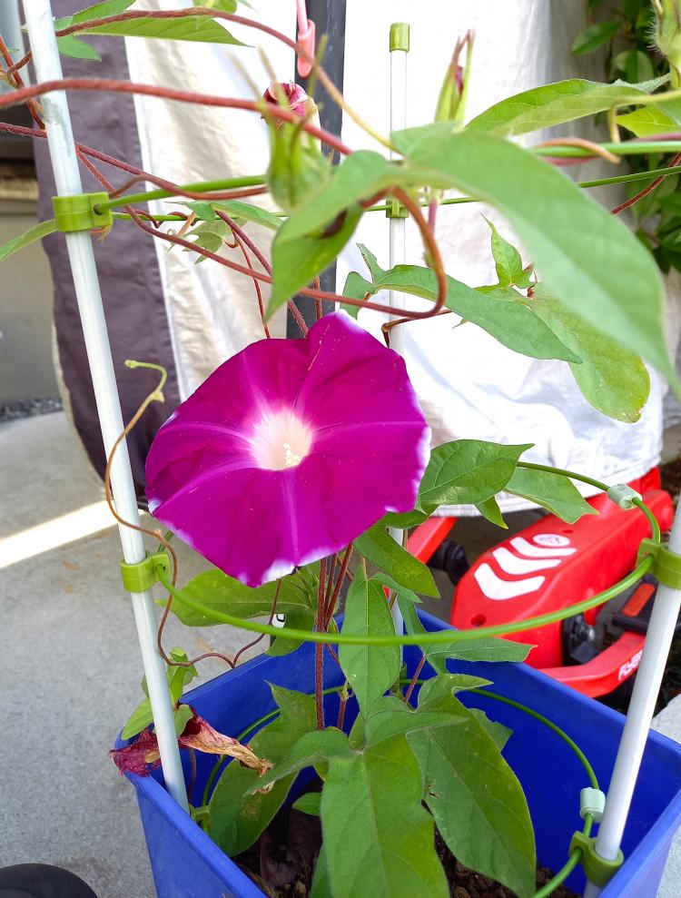 暑くなって出発時間が早くなっているプーさん店長さんとりきちゃん、ぎんちゃんのお散歩から届いた写真は『大きな朝顔』です。夏の着物や浴衣、帯にもよく登場する朝顔。暑い日も元気に過ごせそうな気がします!?