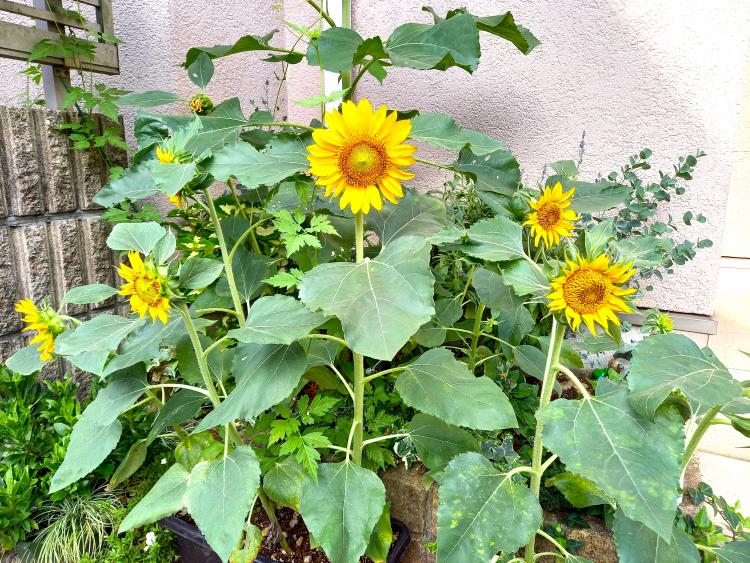 プーさん店長さんとりきちゃん、ぎんちゃんのお散歩から夏らしい『ひまわり』の写真が届きました。沢山のお花の黄色が元気パワーをチャージしてくれるきがします♪