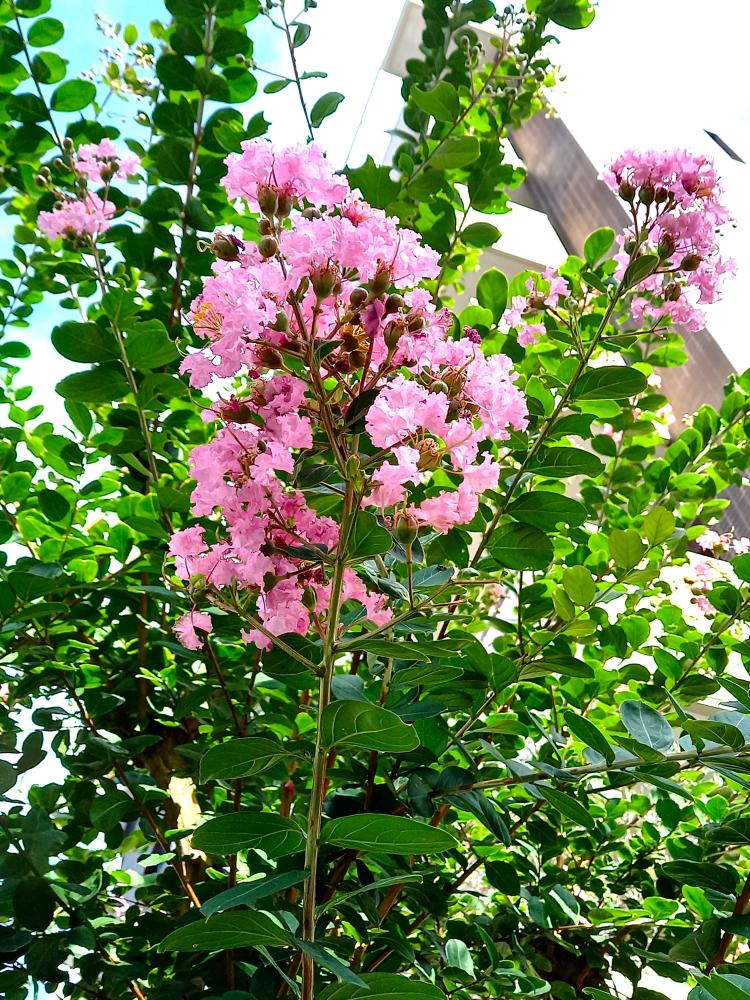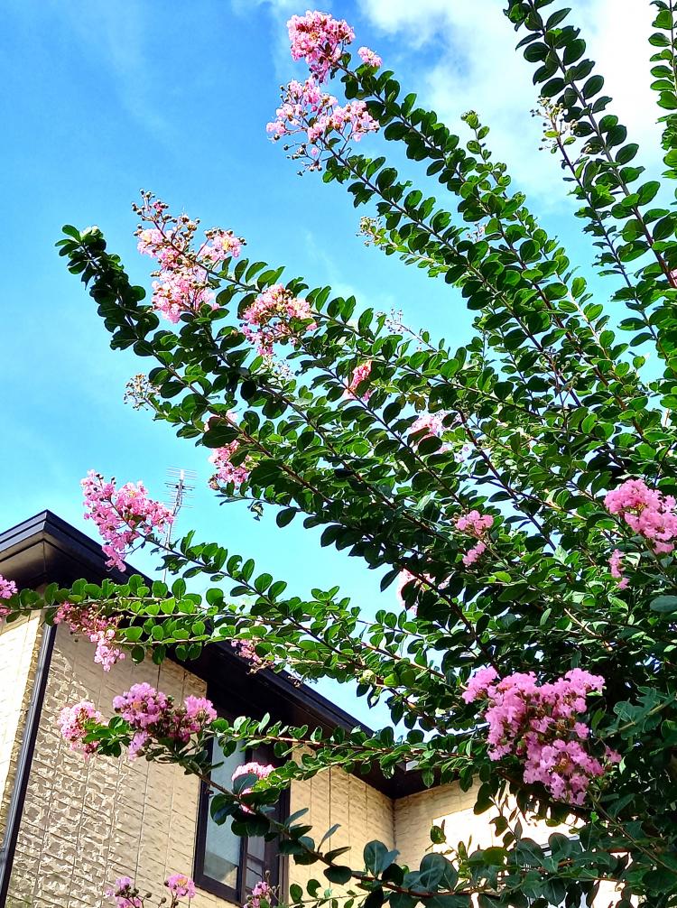 プーさん店長さんとりきちゃん、ぎんちゃんのお散歩から届いた写真は『サルスベリ』です。ふわふわ華やかピンクのお花が、爽やかなブルーの空に映えています。