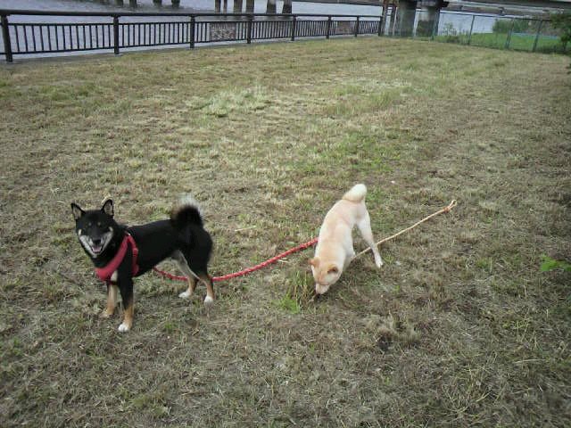 時間があるときは、川岸にある広場で追いかけっこをしたりして、いっぱい遊んでから帰ってくるみたいですよ。この写真のりきちゃんは、カメラ目線でおすまし顔ですね。ぎんちゃんは、何を見つけたんでしょう?