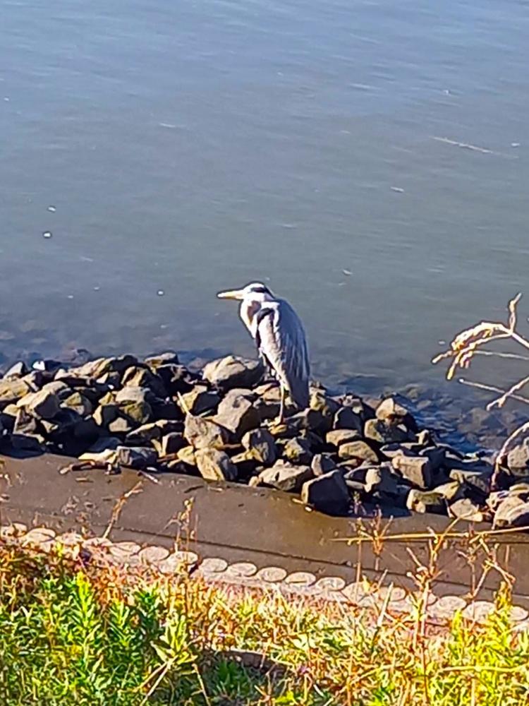 プーさん店長さんとりきちゃん、ぎんちゃんは暖かくしてお散歩です♪川沿いに人がいっぱいいたので、見に行ってみたら鳥さん発見で激写してくれました。多分鷺かなぁ。。。