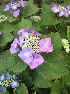 このあじさいは青系と赤紫系とが混在していますね。色が変わっていくのは、地中の酸性度やアルミニウムイオン量によっておこるらしいですよ。と言ってみたものの、私自身はよく分かっていないのですが・・・。色々な色のお花が楽しめるのが楽しいなあってところですね!