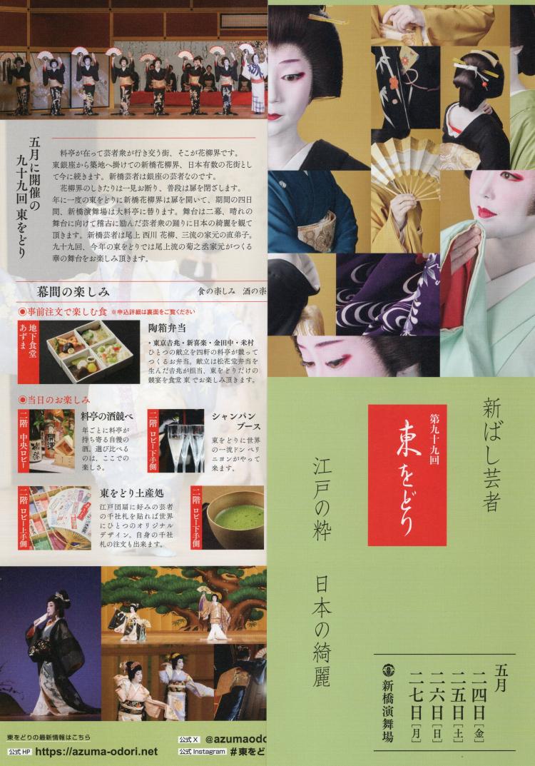 今年も『東をどり-江戸の粋 日本の綺麗-』のポスターとチラシが届きました。年に一度だけ新橋演舞場が大料亭に替わり、新橋芸者さん達の華やかなをどりと老舗料亭の味を楽しめる特別な4日間です。九十九回目を迎える『東をどり』にお出かけになってみては如何でしょうか?