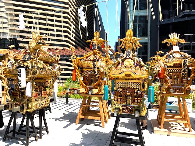 それに伴い〝きもの白〟の目の前の三原橋でお神輿5基が展示され、鐵砲洲囃子が演奏されています。ピッカピカの太陽に照らされたお神輿はキラキラしてとっても格好良かったです。本日16時半まで展示されているそうですので、ぜひご覧になって下さいね♪