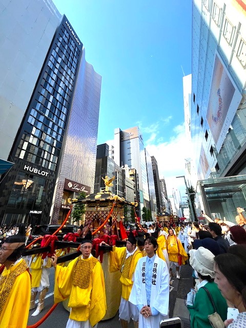 今月は日本三大祭りにも、江戸三大祭りにも数えられる山王祭が開催されています。昨日は神幸行列が行われました。〝きもの白〟から中央通りに向かうとまさにそこを行列が進んでいきます!!お客様と一緒にゆっくり堪能しました。