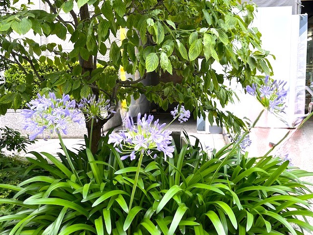 〝きもの白〟の前は、クラッシックコンサートなどが行われる王子ホールがあります。今年も会場の入口辺りに『アガパンサス』が綺麗に咲き始めました。キラキラ太陽で暑い中、プーさん店長さんが写真を撮ってきてくれました♪
