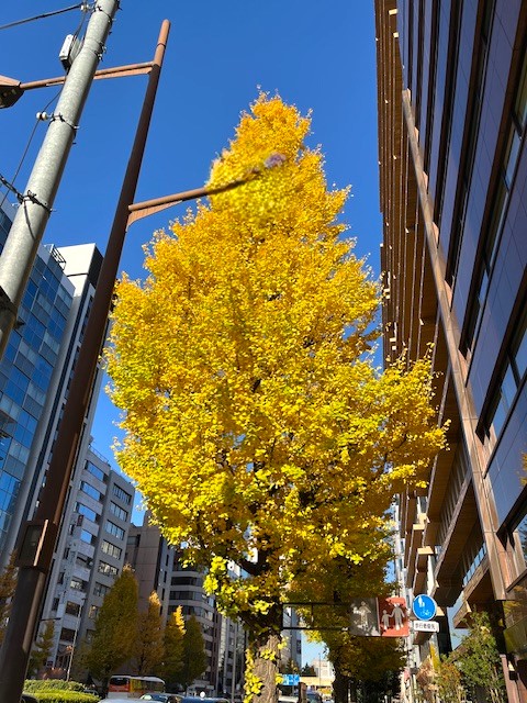 お店からちょっと行くと昭和通り♪銀杏が真っ黄色に色づいてとてもきれいです。所々にまだ色づかない緑いろの木があって、なぜ隣同士でこんなにも色が違うのかと思ったら、楓の木でした。赤くならずまだ青々としていましたよ。