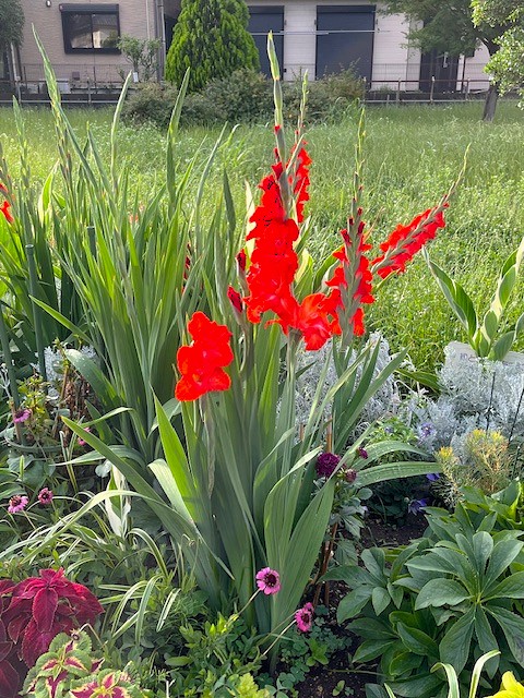 今日プーさん店長さんのお散歩から届いた写真は鮮やかな赤が目を引く『グラジオラス』です。太陽の陽ざしでキラキラして見えますね。