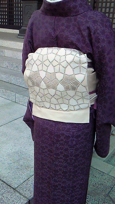 帯は洛風林の物を使っています。ふくれ織りの幾何学模様が目を引く面白い帯です。