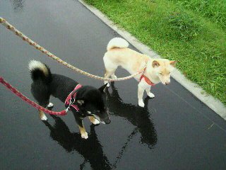 今朝は、けっこうな雨でしたが、一人と二匹は元気にお散歩に出発!!
