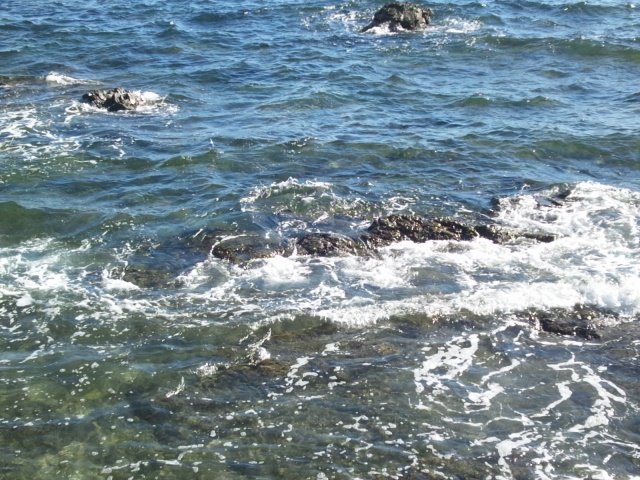 少し顔を出している岩に、波が当たって白いしぶきが上がっています。こういうのもいいですよね。